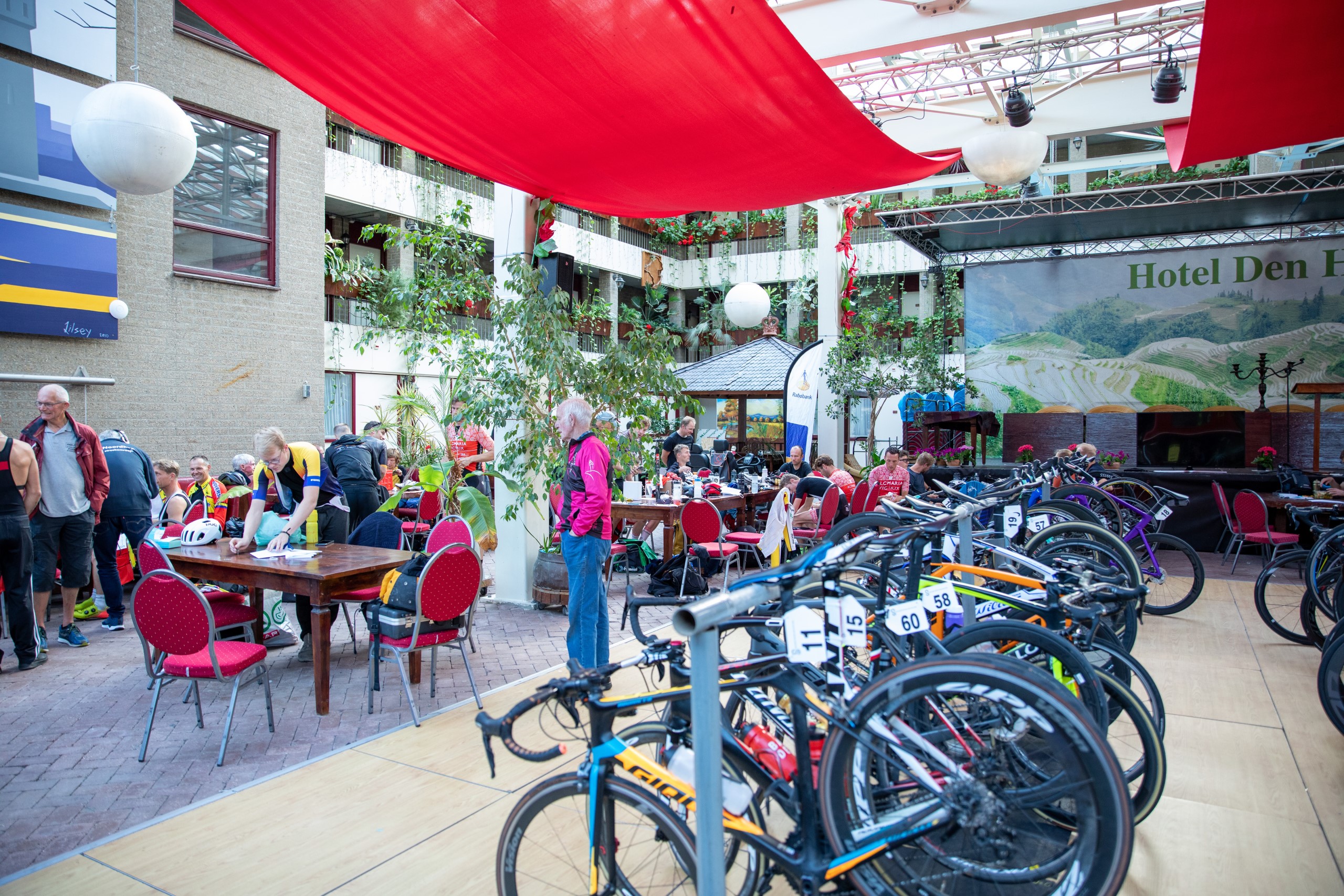 Twee uur sturen later brak Janneke, de wedstrijdsecretaris, het ijs al. Ik had het inschrijfgeld niet voldaan, maar ze wilde me best de nummers geven als ik het alsnog even snel fikste. Hartjes. Twee nummers en een kaderplaatje. Zeldzaamheid bij een amateurwedstrijd. Beetje wannabe, maar gaaf. Maar eigenlijk brak het ijs al wel bij binnenkomst in Hotel Den Helder. Een hotel in Den Helder, dan heb je een beeld (een jaren ’70 bunker met dito uitstraling) en dat beeld wordt grotendeels wel bevestigd bij aankomst. Maar loop even door. Door de bowlingbaan naar de binnenplaats. Daar heeft de organisatie namelijk een compleet tourdorp gebouwd: fietsenrekken voor de deelnemers, een podium met presentatie, rondemilf, vrijwilligers en zitjes voor de deelnemende teams. De lokale zender die alles integraal uitzendt. Pers, fotografen, TV. En superlieve mensen. Overal superlieve mensen die de renners met alle egards behandelen en je het gevoel geven dat je dit weekend net iets specialer bent dan normaal. Mensen die je helpen met je spulletjes, bezorgd navragen hoe het gaat met je gewonde clubgenoot en alles doen om je in de watten te leggen. “Je hebt nog wat tandpasta in je mondhoek, da’s niet soigné”. Ik kon die man wel zoenen.